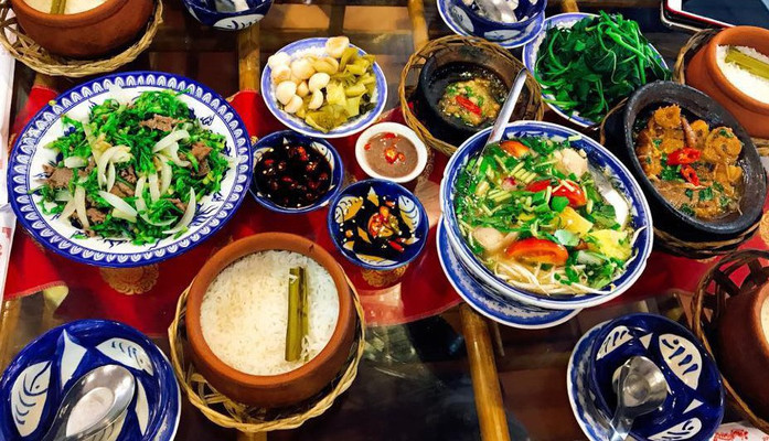 - Món đỉnh: Cá kho tộ, bông bí xào tỏi, canh chua tôm. Cơm được nấu trong niêu đất, có lớp cháy giòn rụm ở đáy, ăn kèm với cà pháo mắm tôm thì “hao cơm” vô cùng.