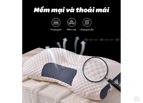 • Ưu điểm: Thiết kế rỗng ở giữa đỉnh đầu giúp giữ tư thế nằm ngửa chuẩn xác, trong khi hai bên cánh gối được nâng cao 12cm để hỗ trợ người nằm nghiêng, giúp vai không bị đè nén.