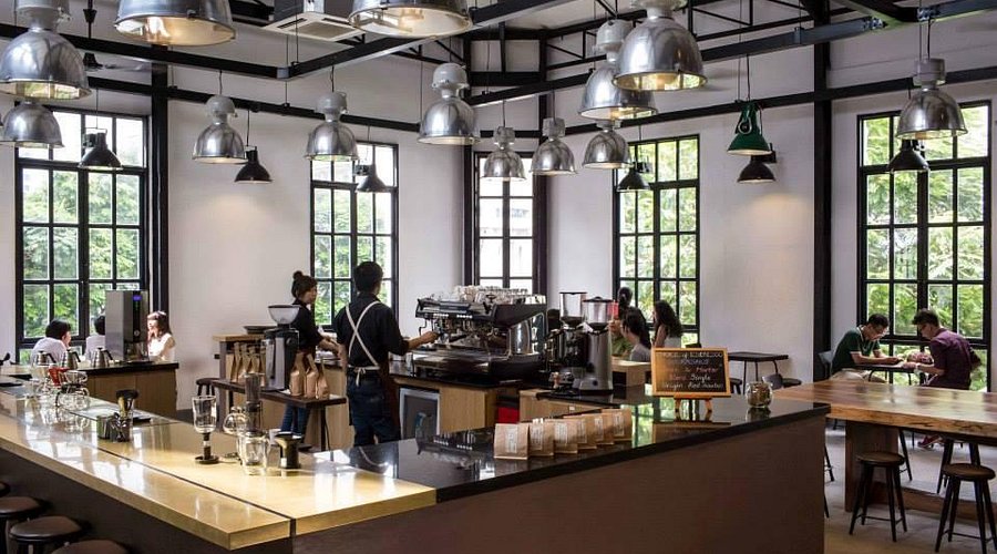 Đặc điểm: Không gian industrial chic với tone màu đen chủ đạo, máy rang cà phê lớn đặt ngay giữa quán. Barista tay nghề cao, latte art đa dạng từ cơ bản đến nâng cao.