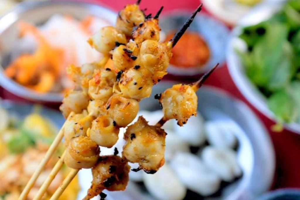 Từng bị coi là “phụ phẩm”, nhưng giờ đây răng mực đã trở thành món ăn chơi nổi tiếng nhất Phan Thiết. Những xiên răng mực nhỏ xíu được tẩm ướp đậm đà, nướng trên than hồng cho đến khi giòn rụm, ăn kèm với đồ chua và rau răm.