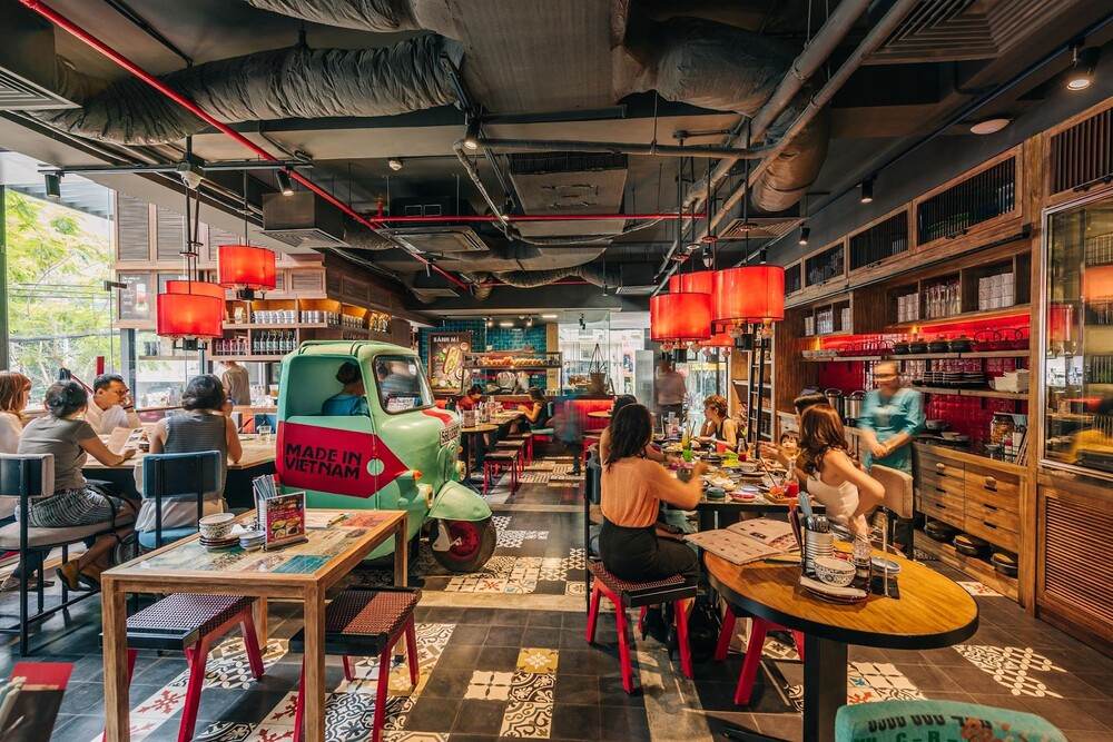 Điểm nhấn chiếc xe lam: Chiếc xe lam màu xanh cổ điển với dòng chữ “Made in Vietnam” được đặt ngay trung tâm nhà hàng, không chỉ là bàn ăn độc đáo mà còn là góc chụp ảnh check-in được yêu thích.