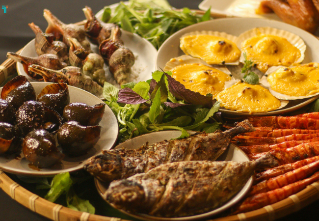 Đội ngũ đầu bếp bản xứ Nha Trang mang đến những món ăn đậm chất miền biển với cách chế biến truyền thống. Các món ngon như tôm sú nướng muối ớt, mực một nắng nướng sa tế, ốc hương xào bơ tỏi đều giữ được hương vị đặc trưng của hải sản Nha Trang.