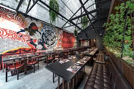 Thiết kế bếp mở quầy bar dài, khách ngồi sát khu vực nướng, quan sát đầu bếp xử lý cá tươi, nướng trên than binchotan (than trắng Nhật) nhiệt 800°C. Không gian tối giản, gỗ tự nhiên, đèn lồng Nhật, sức chứa 80-120 khách tùy chi nhánh.