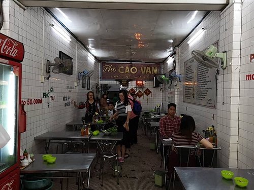 Bước vào Phở Cao Vân, cái gì cũng cũ kỹ và quen thuộc như nụ cười tuổi cổ lai hi của ông chủ. Bức tường gạch men, sàn nhà gạch ô vuông nhỏ xíu, cái tivi đời cũ mấy mươi năm, lò nấu phở bằng củi truyền thống, và bài “Phở đức tụng” trên tường tạo nên không gian mộc mạc đầy ký ức.