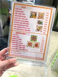 Flan truyền thống (8.000 VNĐ), flan + nước cốt dừa (12.000 VNĐ), rau câu nhân phô mai (10.000 VNĐ), rau câu nhân dừa (10.000 VNĐ).