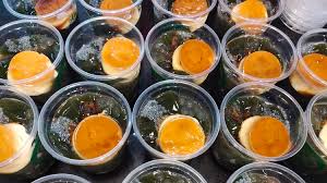 Bánh Flan Thái Thủy tại 893 Hoàng Sa, Q.3, nổi tiếng cách ăn độc đáo: flan + nước cốt dừa thay vì cà phê, kết hợp rau câu.