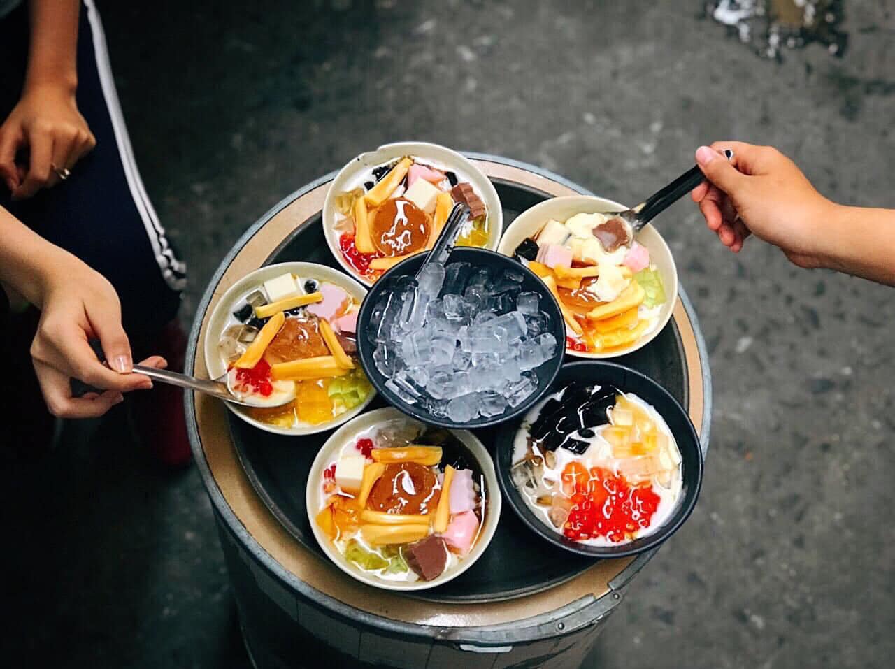 Tàu hủ trắng mềm thơm đậu nành + flan béo ngậy + các topping khác (bánh lọt, thạch, trân châu), 25.000-35.000 VNĐ/tô. Ăn nóng: béo ngậy, ăn lạnh: thanh mát nhẹ vị.