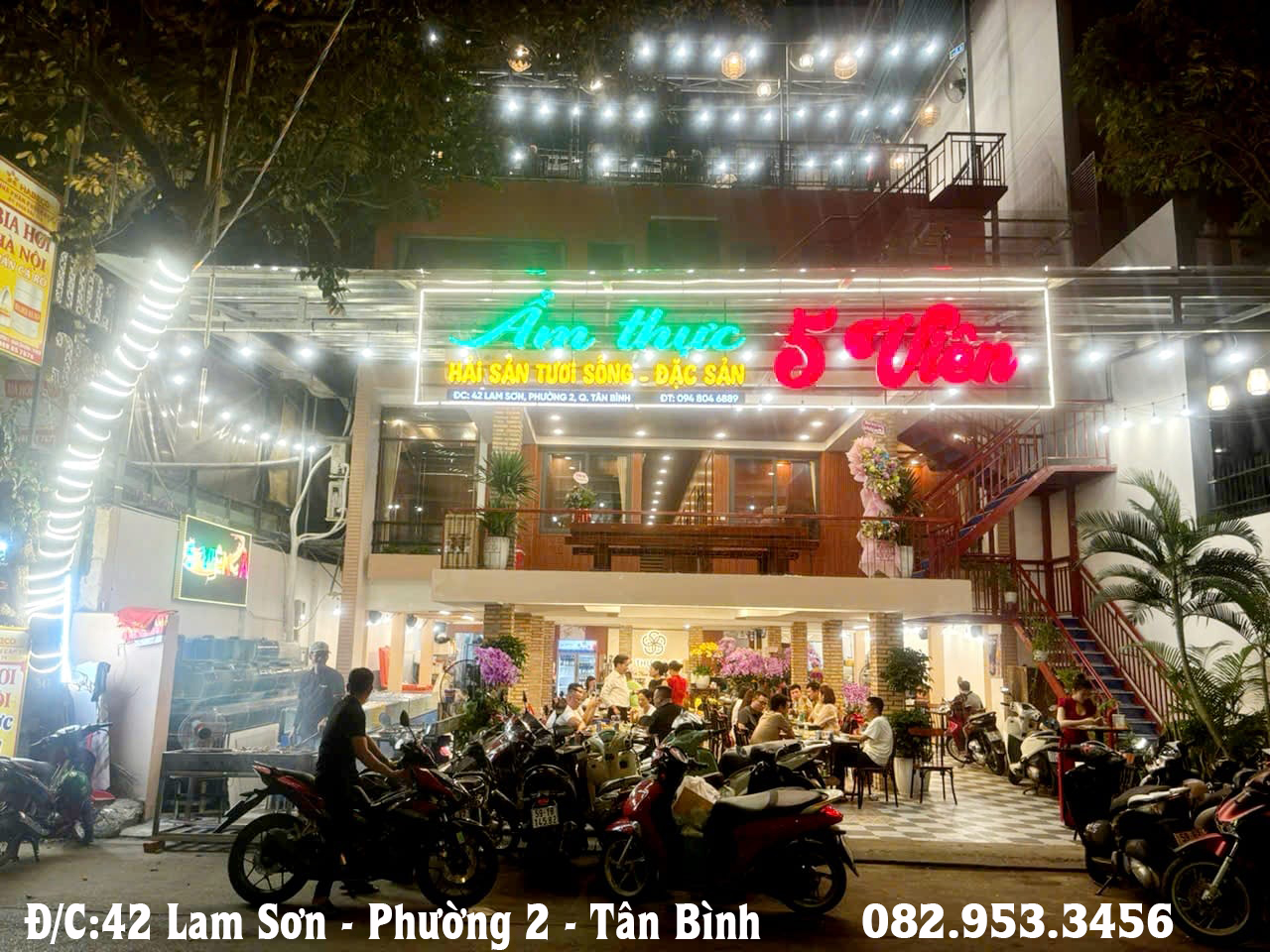 Ẩm Thực 5 Viên tọa lạc tại 42 Lam Sơn, Phường 2, Tân Bình, TP.HCM, chỉ cách sân bay Tân Sơn Nhất khoảng 1.5km, là điểm đến yêu thích của giới sành ăn nhờ không gian rộng rãi, sân thượng sức chứa 100 người và phòng VIP riêng tư. Quán nổi bật với thực đơn hơn 100 món hải sản tươi sống, từ cá bơn, tôm sú, cua, nghêu, sò, ốc đến các món đồng quê như gà ta, vịt quay, rau củ hữu cơ.