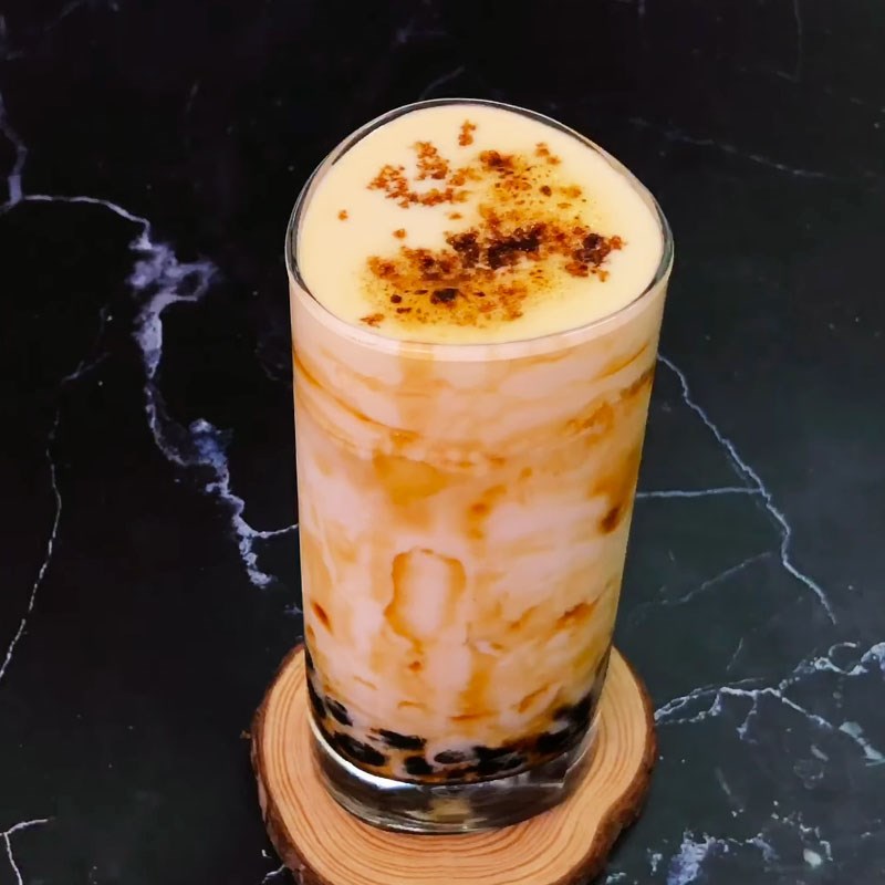 - Sữa tươi trân châu đường đen Kem trứng nướng (Crème Brûlée): Lớp kem trứng (Custard) béo ngậy được phủ lên trên, rắc thêm chút đường nâu rồi dùng đèn khò (Torch) đốt cháy xém. Mùi khét nhẹ của caramel cháy quyện với vị béo của trứng tạo nên sự bùng nổ vị giác.